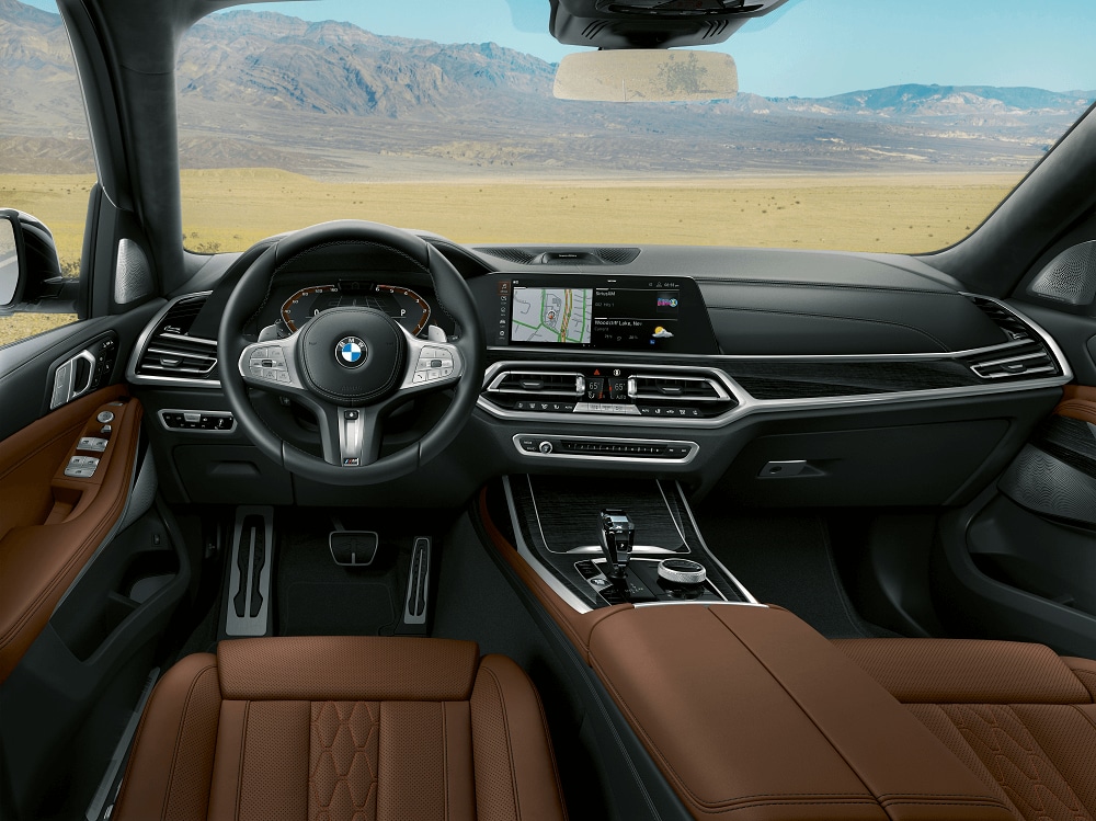 Inside the 2021 BMW X7, you'll discover an array of premium appointments, like supple Extended Merino leather or Vernasca Leather upholstery and a Fineline stripe brown high-gloss Wood trim.