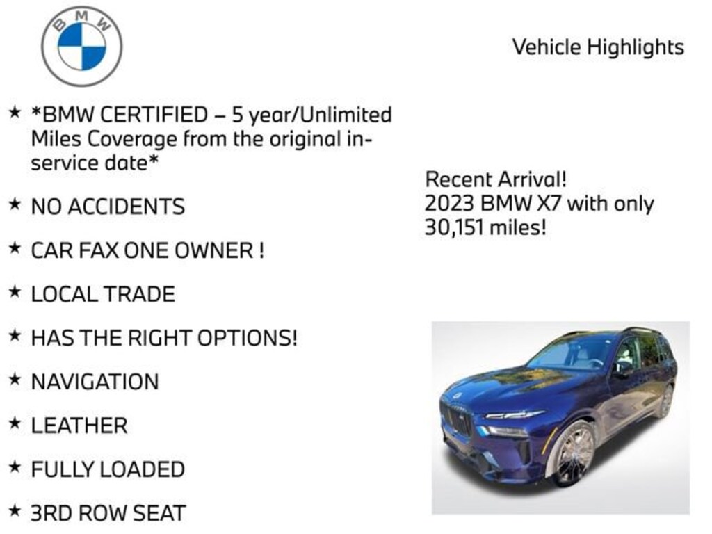 As a BMW Certified Pre-Owned vehicle, this 2023 X7 M60i comes with a comprehensive warranty and a host of additional benefits that provide you with peace of mind. From the Multipoint Inspection to the Transferable Warranty and Roadside Assistance, you can trust that this SUV has been meticulously cared for and is ready to deliver an exceptional driving experience.