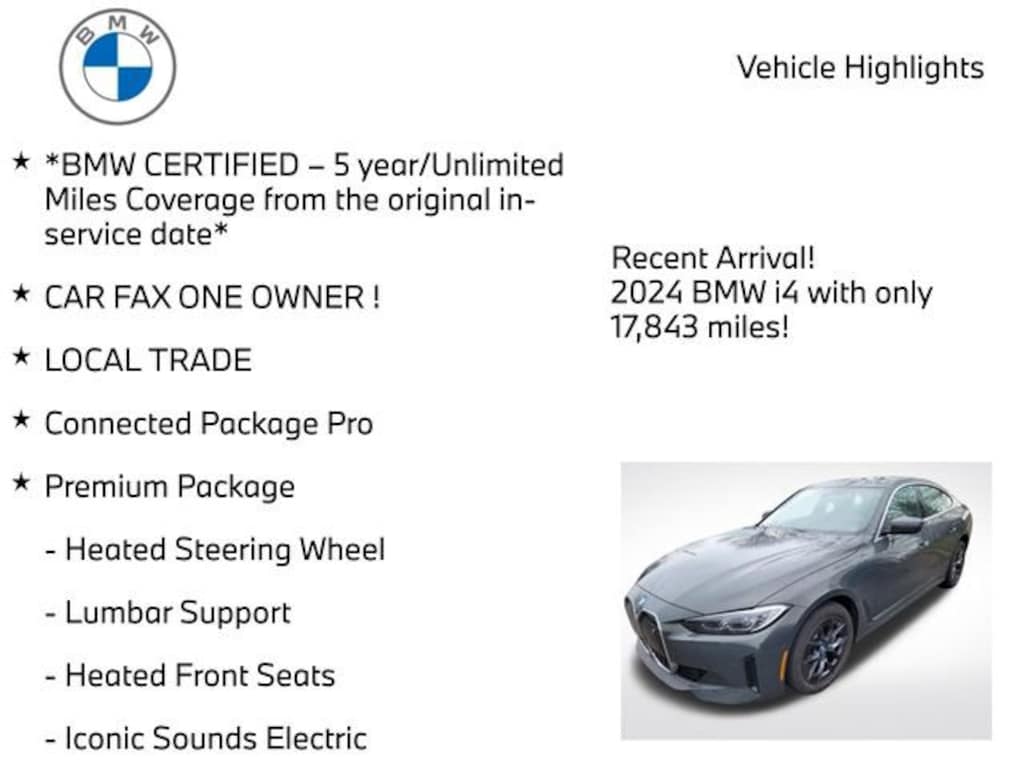 Discover the unparalleled driving experience of the 2024 BMW i4 eDrive35. This certified pre-owned gem is a true testament to BMW's commitment to innovation and craftsmanship. Schedule a test drive today and let us demonstrate how this exceptional vehicle can elevate your driving pleasure.