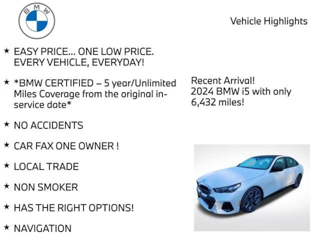 This 2024 BMW i5 M60 is a rare find, offering unparalleled luxury, performance, and efficiency. Don't miss your chance to experience the ultimate in electric driving pleasure. Contact us today to schedule a test drive and make this exceptional vehicle your own.