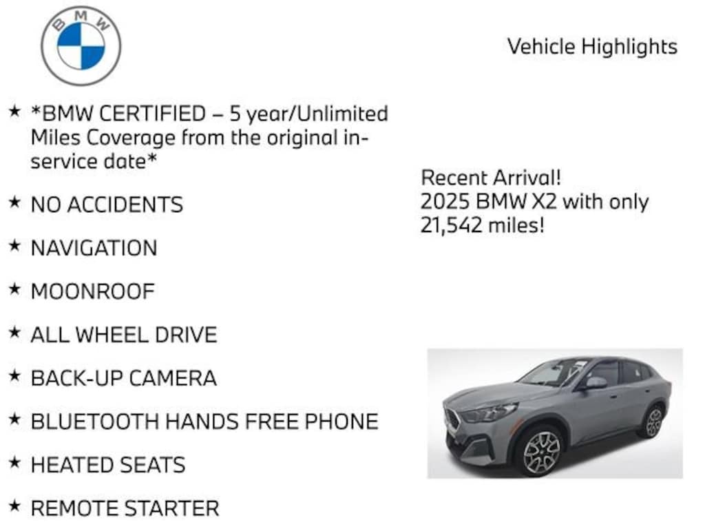 Discover the epitome of modern luxury and performance with this exceptional 2025 BMW X2 xDrive28i. Meticulously maintained and boasting a stunning Gray exterior, this BMW Certified pre-owned SUV is a true gem, offering the perfect blend of style, technology, and capability.