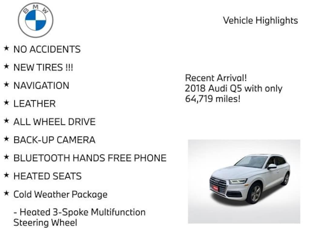 Discover the perfect blend of style, technology, and capability in this meticulously maintained 2018 Audi Q5 2.0T quattro. Experience the thrill of Audi's renowned engineering and craftsmanship. Visit our showroom today and let us demonstrate why this exceptional SUV should be your next automotive companion.