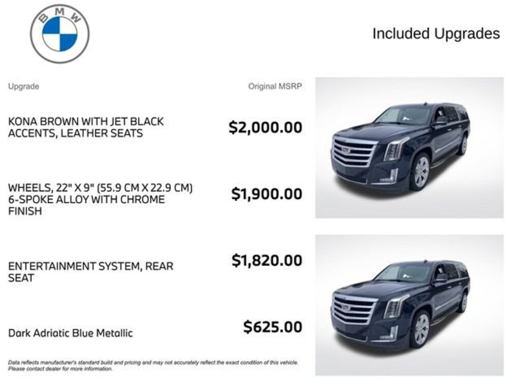 Adorned in the captivating Blue exterior, this Escalade ESV Luxury exudes a sophisticated and refined aesthetic. The interior is equally impressive, featuring Kona Brown with Jet Black accents, complemented by premium leather seating surfaces and a host of advanced technology features.